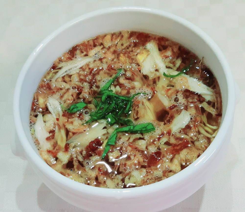 De soep is gevuld met gefrituurde uitjes, gefrituurde aardappel mini frietjes, taugé, geplozen kipfilet, eitje, gefrituurde mihoen en selderij op een overheerlijke basis van kippenboullion